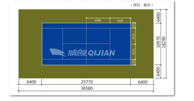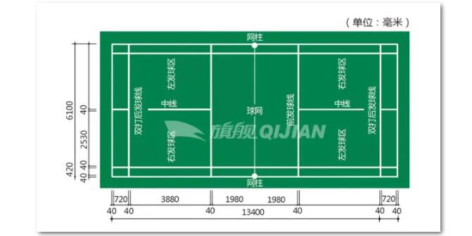 1、羽毛球場、長方形線寬4cm顏色白色或黃色;尺寸13.4x6.1米雙打;13.4x5.18米;